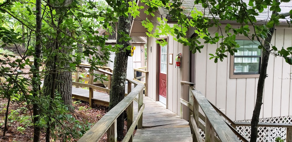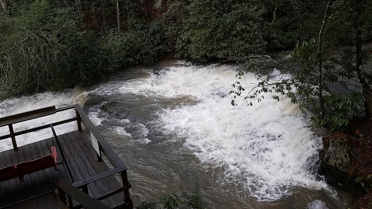 This is a beautiful location, the family that operates it are very nice people, the rooms are clean, and it is reasonably priced. The town of Clayton is just minutes away, with all amenities. Most of the suites have at least a partial view of the small waterfall on the property, and the rest are only a minute's walk away from the viewing deck. The only reason that I withhold the last star is the design of the place. Most of the rooms interconnect, and the noise bleed through those doors can be annoying- the gap under one of ours was about a full inch. The rooms were built to the contour of the hollow which leaves some of them with some odd floor plans; the bathroom in our last room was L-shaped, with the toilet in a tiny nook, and the sink in the main room. Blackout curtains would be nice, as the security lights keep the window shades lit brightly at night. Overall, this place is a great getaway at the price. The picture was taken the day after there were flood warnings in the area. Not to worry, the rooms are far above the deck. The creek is normally much more placid!